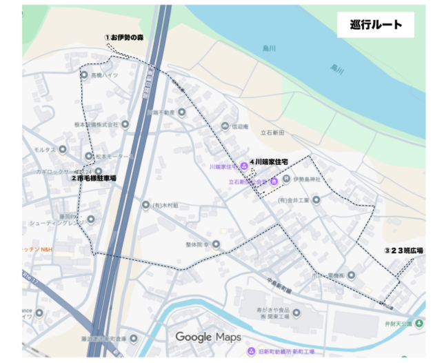 巡行ルートは下↓のように、伊勢島神社〜①お伊勢の森〜②市毛様駐車場〜③23班広場〜④川端家住宅、距離にして1.5kmのコースです。天候は曇りで暑さはなかったものの、1.5kmを獅子頭をかぶりながら歩き箇所箇所で踊るという行程に、子どもたちもさすがに疲れたようでした。